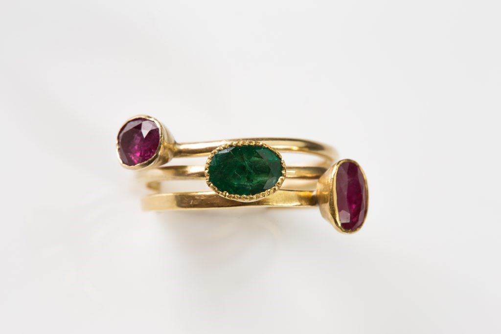 טבעות זהב 18 קראט בעבודת יד, כל אחת משובצת באבן חן טבעית – רובי בגוון אדום עז או אמרלד בגוון ירוק עמוק.