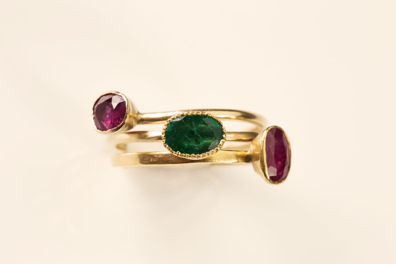 טבעת זהב משולשת עם אבן רובי אדומה – עיצוב בעבודת יד