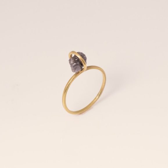 טבעת זהב 18 קראט בעבודת יד עם יהלום גולמי אפור תלוי