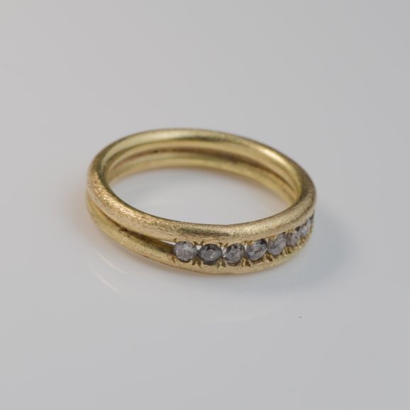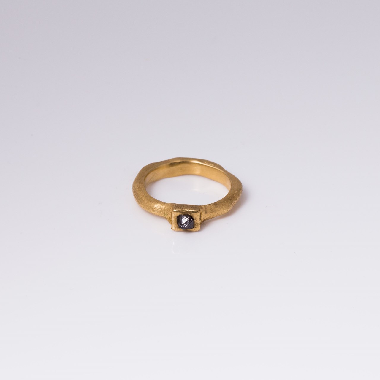 מפוסלת בעבודת יד בגימור גולמי־אורגני. משובצת יהלום גולמי טבעי במשקל 0.7 קראט –