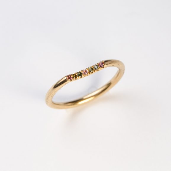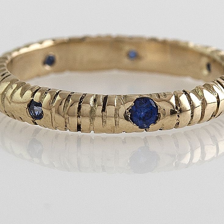 טבעת זהב 18 קראט עם טקסטורה עבודת יד ושיבוץ ספירים כחולים בגדלים שונים