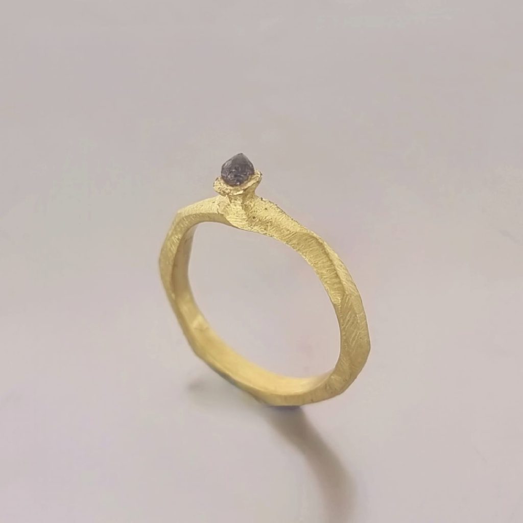 טבעת זהב 18 קראט בגוון צהוב חם, מפוסלת בעבודת יד בצורניות אורגנית וא־סימטרית,