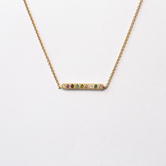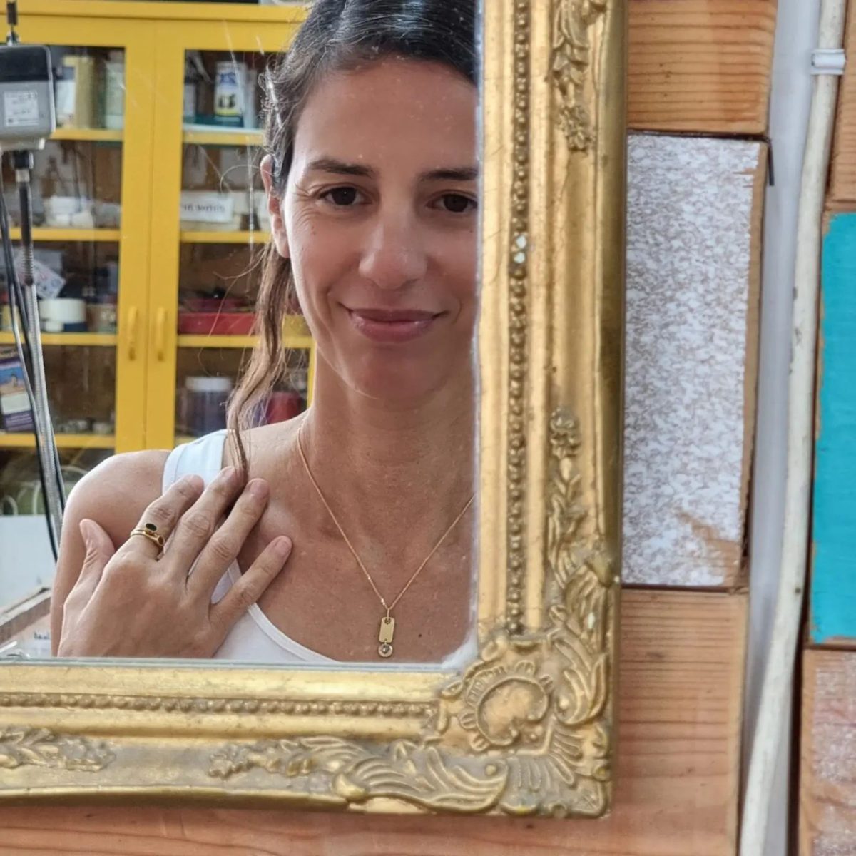 השרשרת עשויה זהב 18 קראט, ועליה תלויה דיסקית מלבנית מעוצבת בעבודת יד,