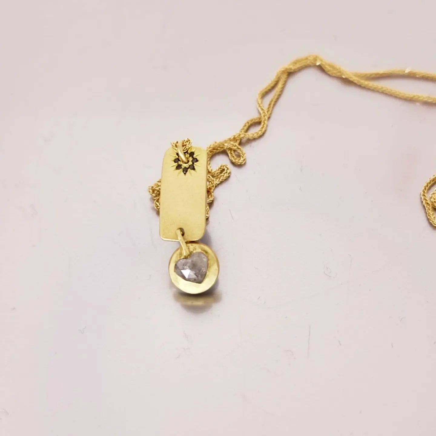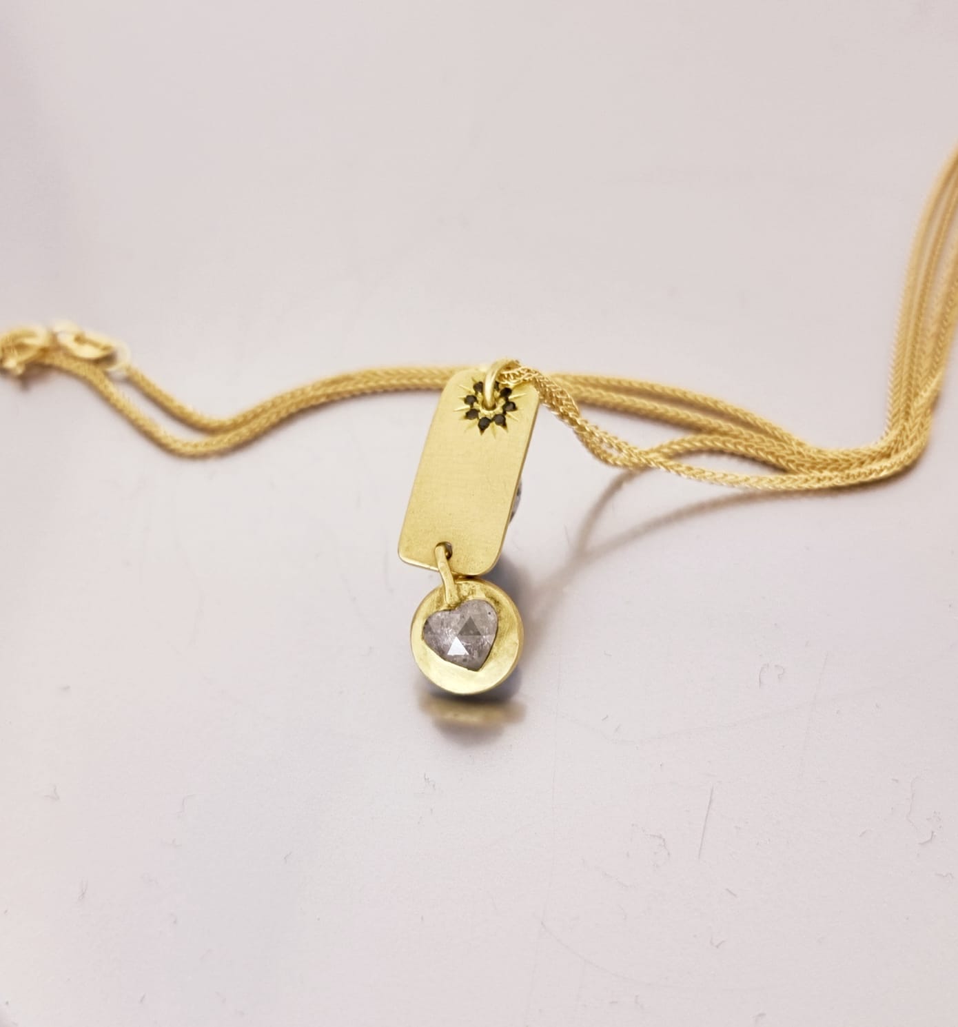 שרשרת יהלום גולמי לב מזהב 18 קראט תליון מלבני עם יהלומים שחורים