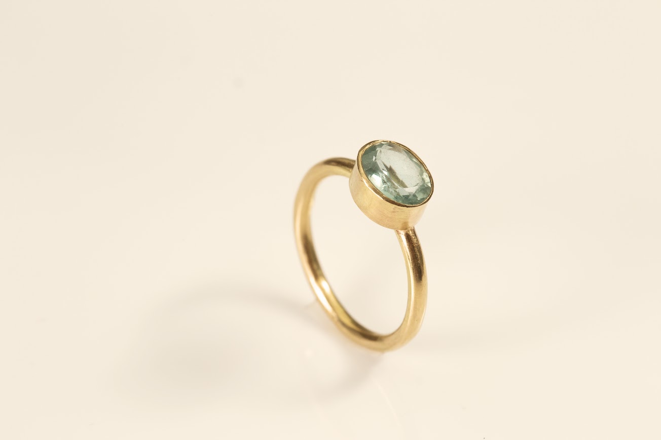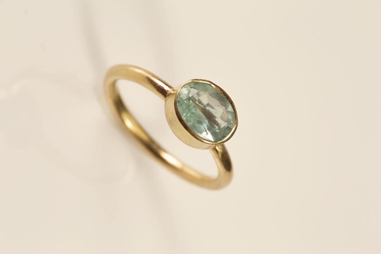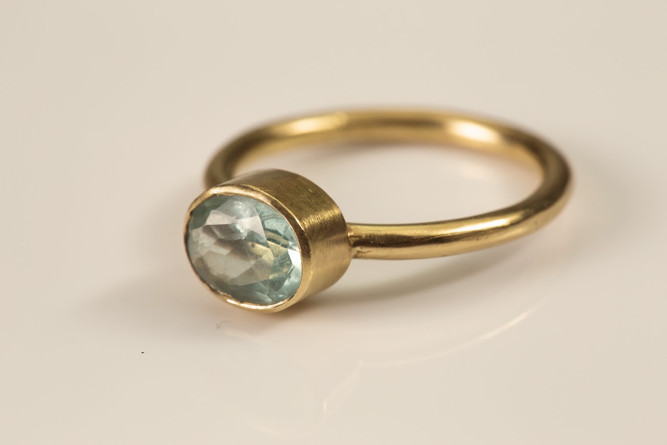ומשובצת באבן אקווה־מרין אובלית בגודל 10×8 מ"מ –