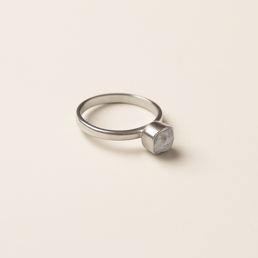 טבעת זהב לבן עם יהלום גולמי בעיצוב נקי ומודרני