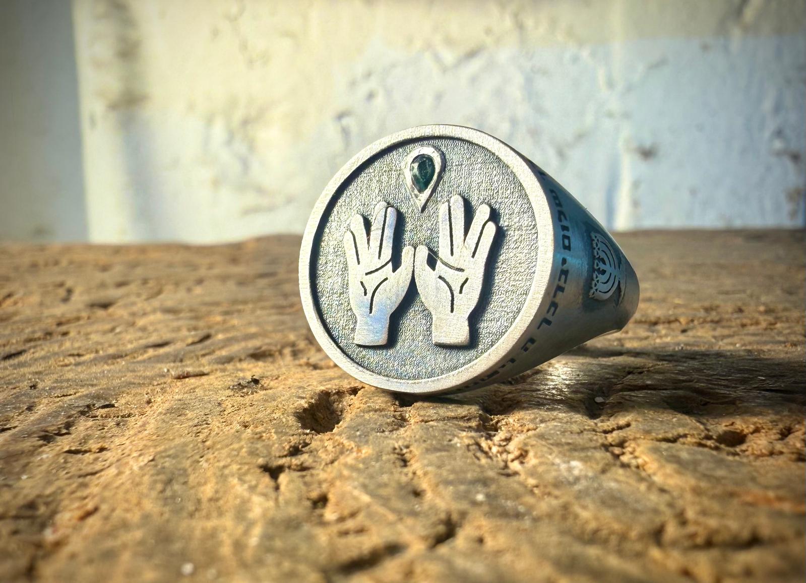 במרכז הטבעת תבליט של שתי ידיים סמל לאחריות, קבלה ופעולה מודעת