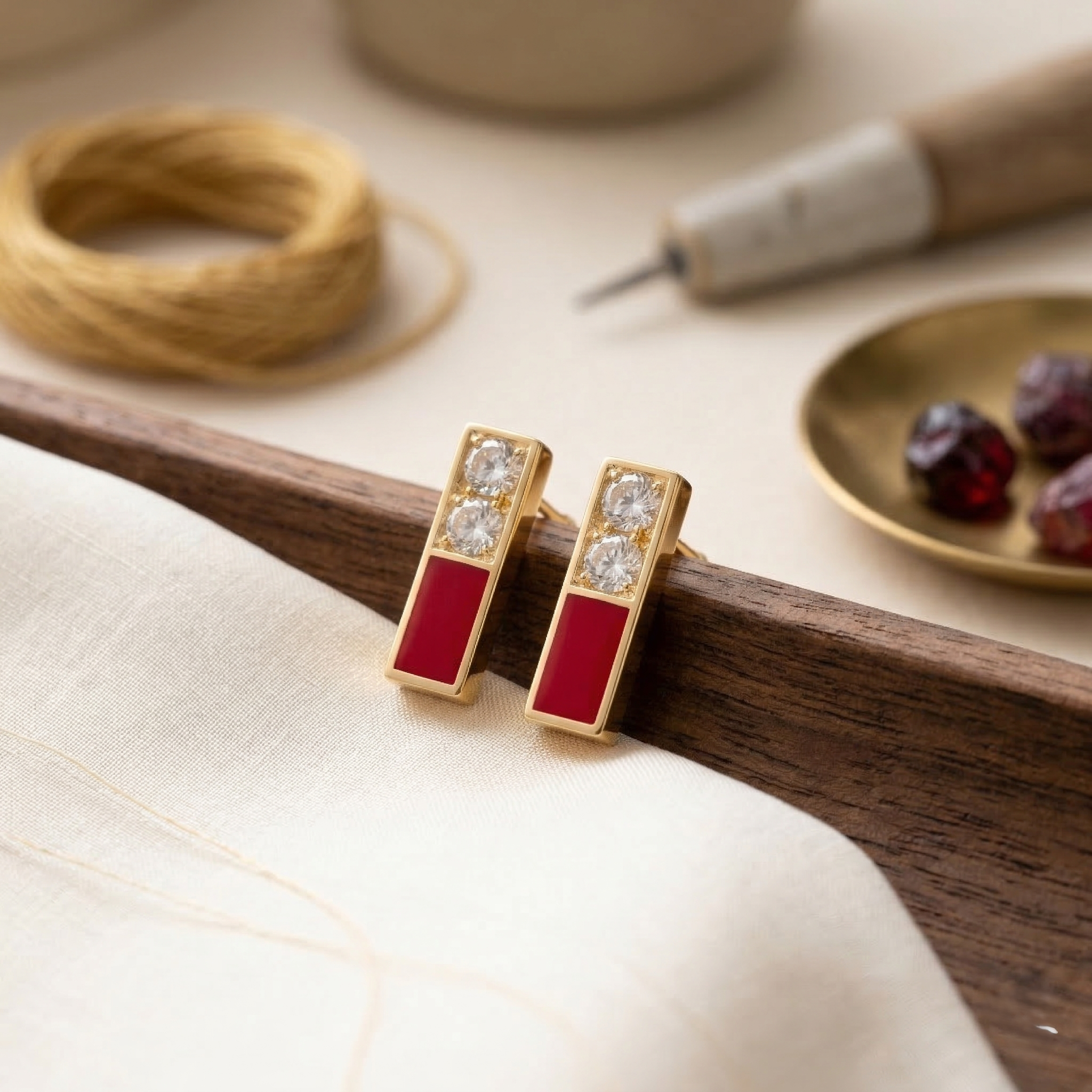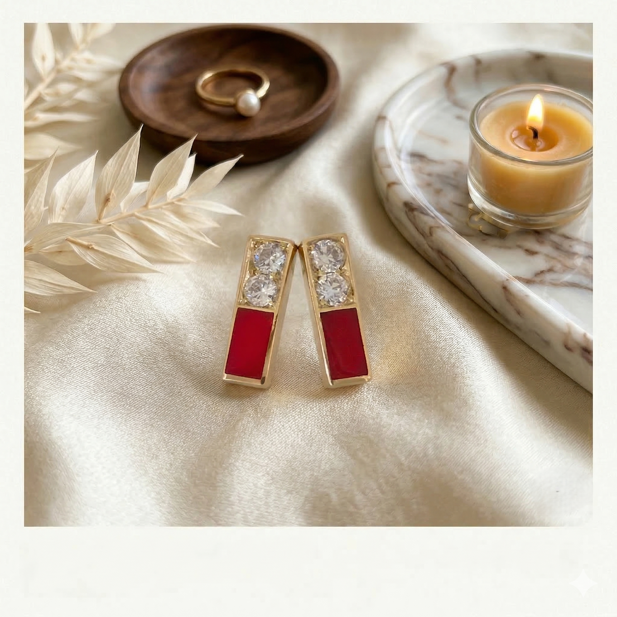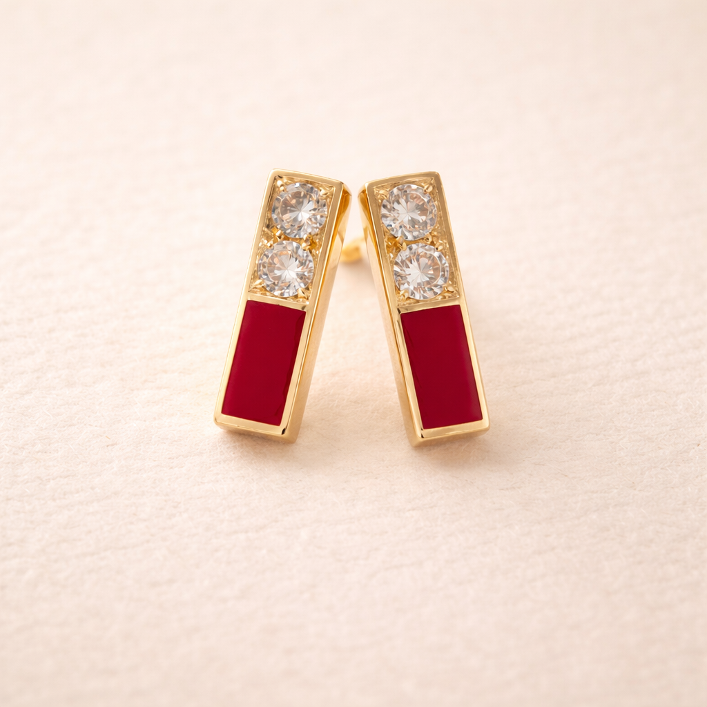 עגילי זהב 14 קראט עם יהלומים ואמייל אדום עגילים מודרניים