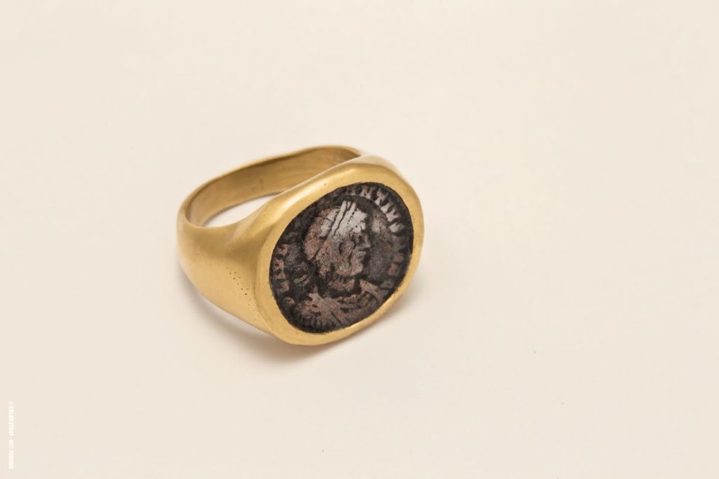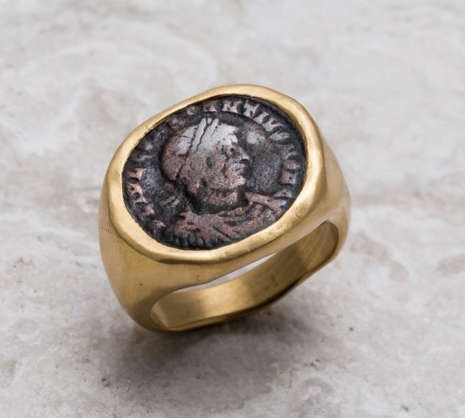 טבעת חותם מזהב 22 קראט, בעבודת יד מדויקת, משובצת במטבע עתיק בקוטר של כ־17 מ"מ. הקוטר עשוי להשתנות בהתאם למטבע הנבחר.
