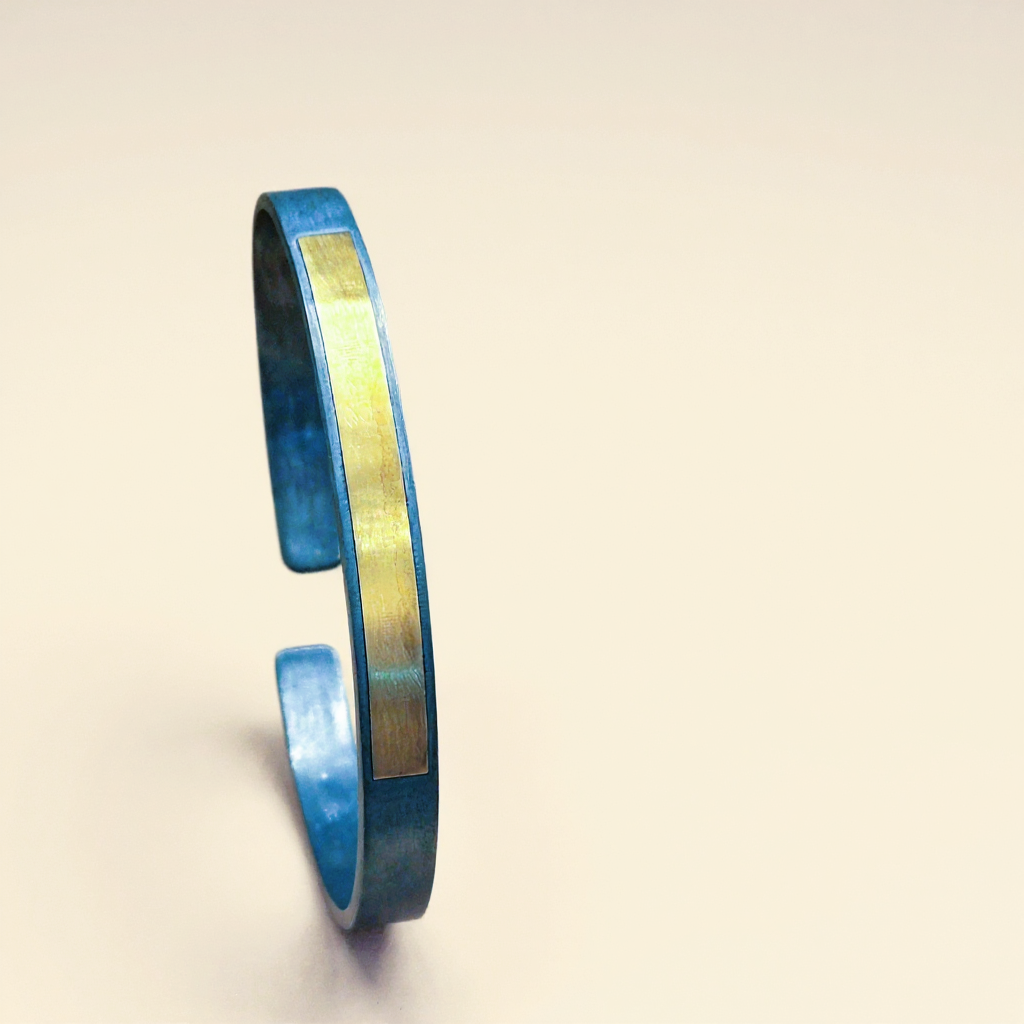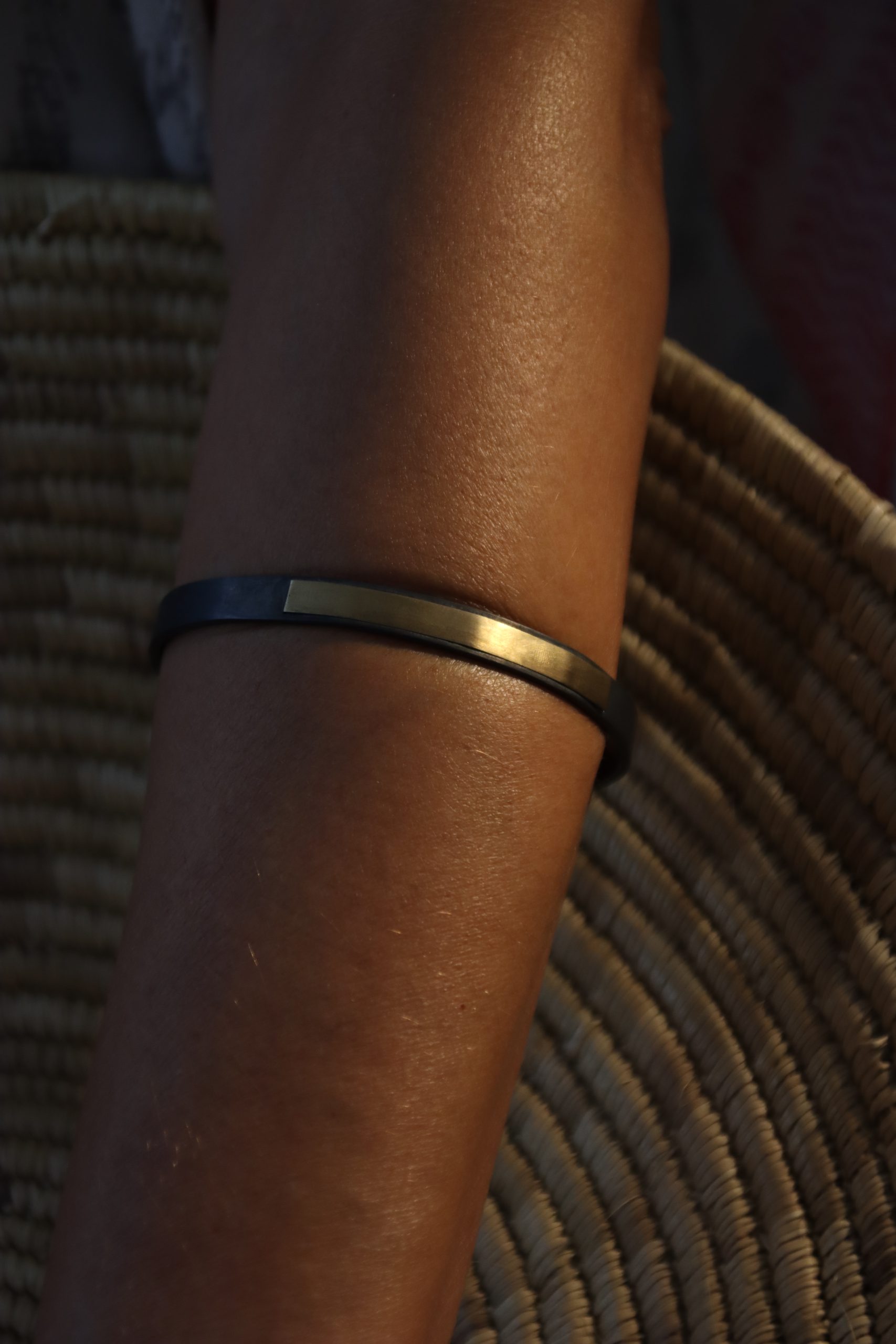 צמיד קשיח לגבר, בעבודת יד, עשוי כסף סטרלינג 925 מושחר עם פס זהב 14 קראט בחזית.