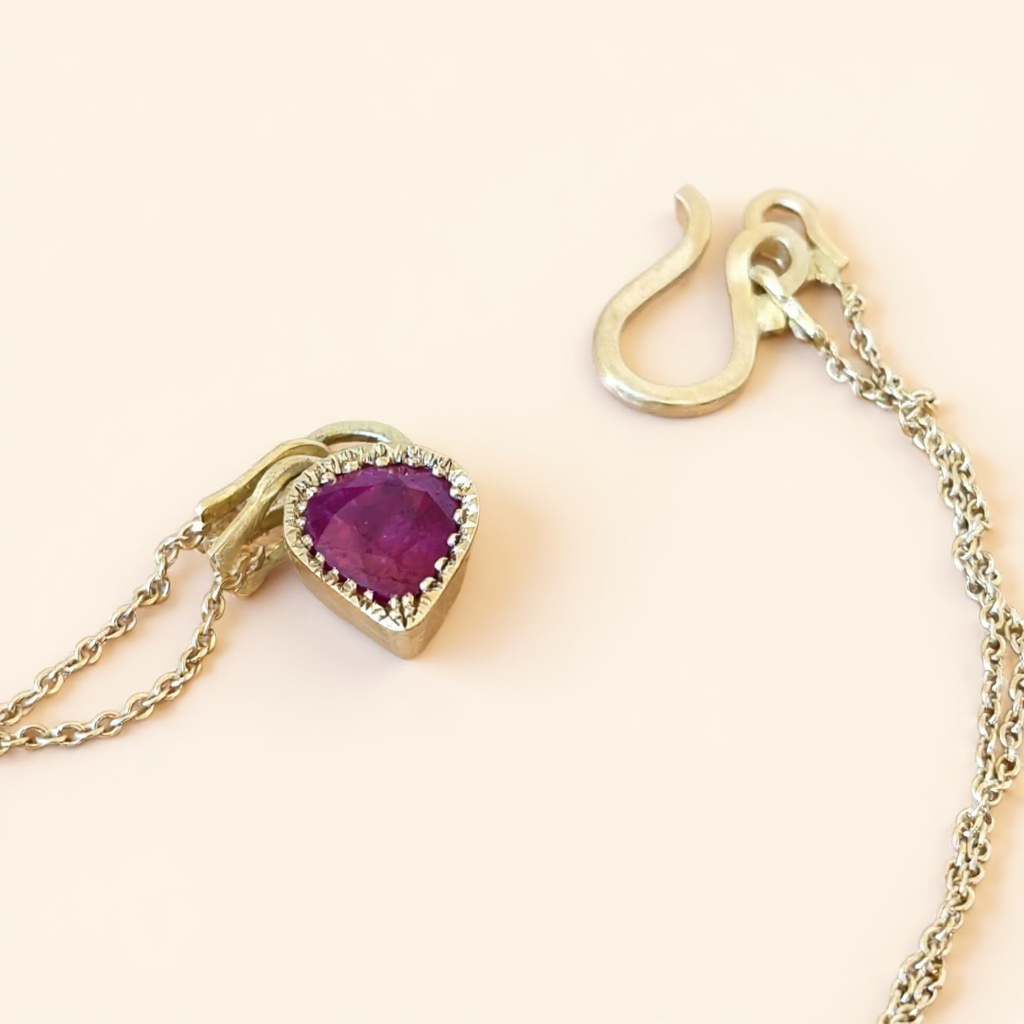 ממנה משתלשל תליון 18 קראט המשובץ באבן רובי מרשימה ביותר