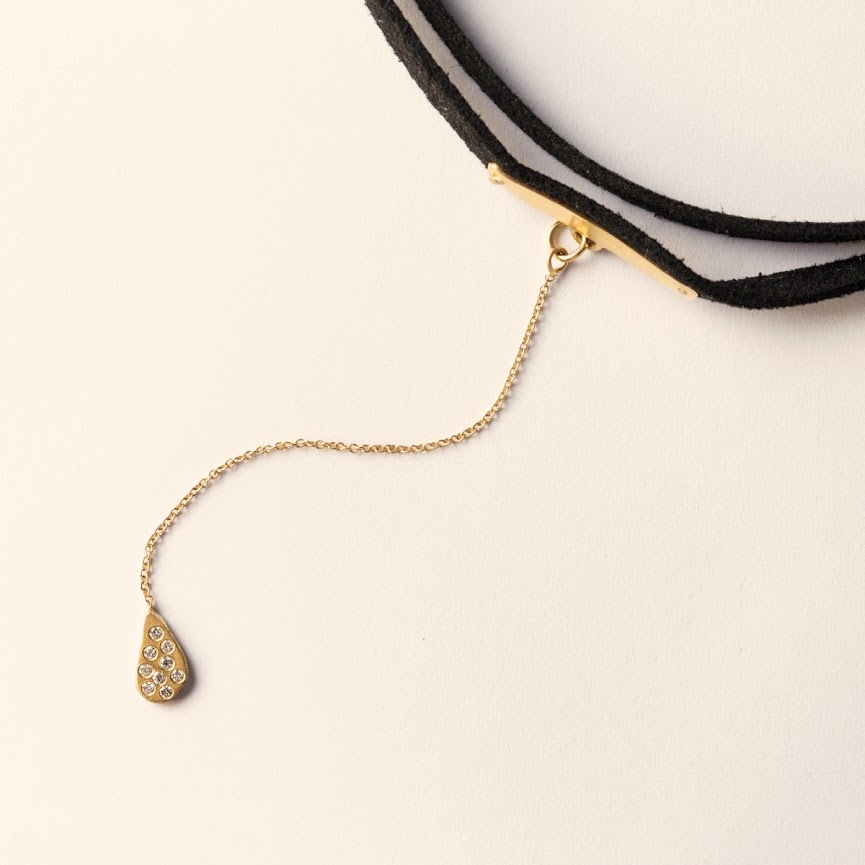 מחוברת אליה לוחית זהב 18 קראט שממנה משתלשלת טיפה עדינה משובצת יהלומים נוצצים.