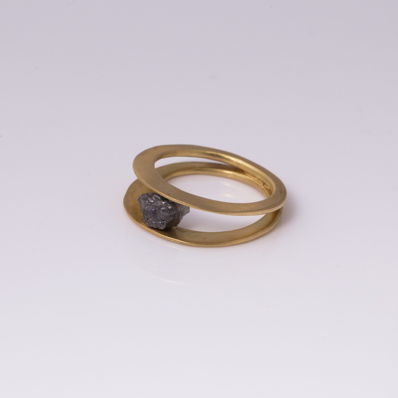 שתי טבעות זהב שטוחות בעובי 0.8 מ"מ כל אחת, בעבודת יד מדויקת, יוצרות יחד מראה אלגנטי ומודרני שמדגיש את היהלום הגולמי המרהיב שביניהן. היהלום (כ־1.2 קראט) מונח במרווח של 7 מ"מ – מחזיק את כל המהות במינימליזם מדויק.