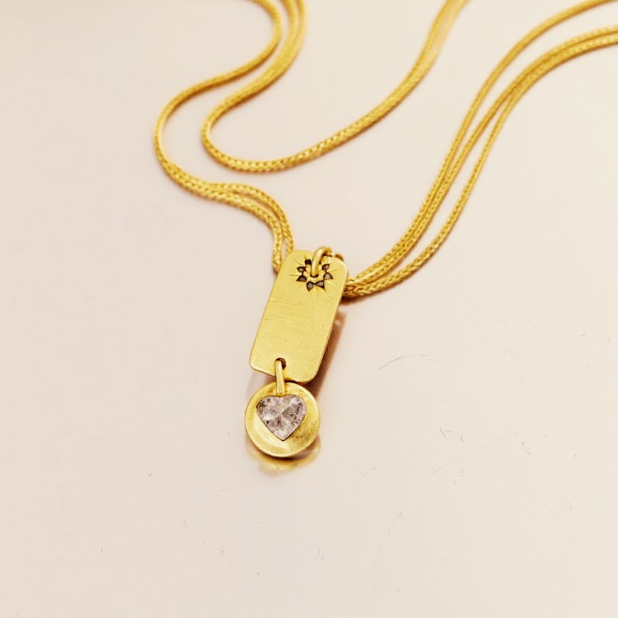 השרשרת עשויה זהב 18 קראט, ועליה תלויה דיסקית מלבנית מעוצבת בעבודת יד,