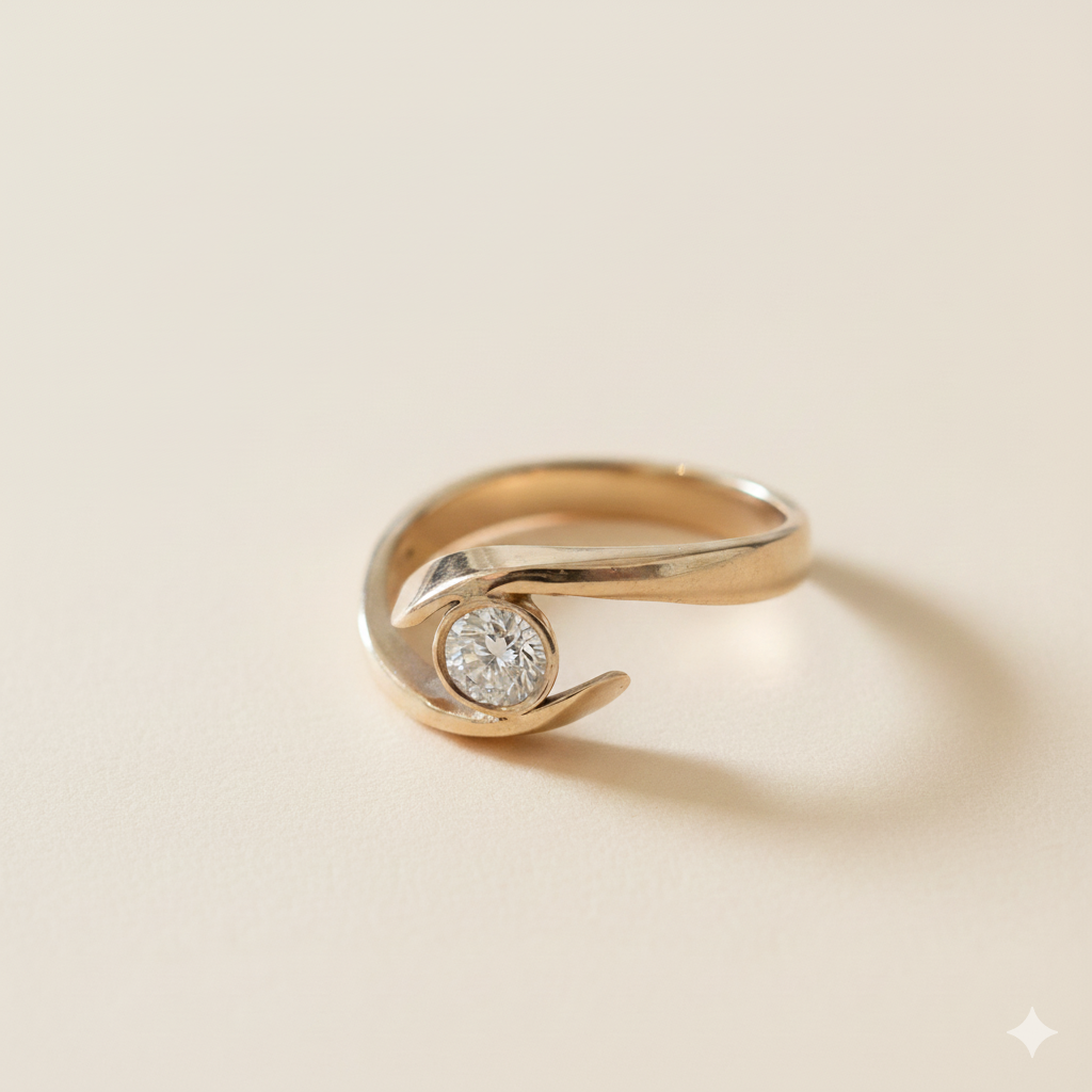 טבעת אירוסין משולבת בזהב 18 קראט, בעיצוב ייחודי שמחבק את היהלום בתנועה אורגנית ורכה.